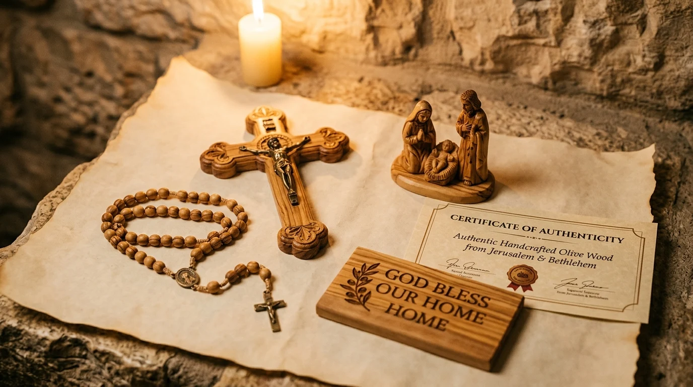 All our pieces are handcrafted by Christian artisan families in Jerusalem and Bethlehem using olive wood from pruned branches and naturally fallen trees. Each includes a Certificate of Authenticity verifying genuine Holy Land origin.