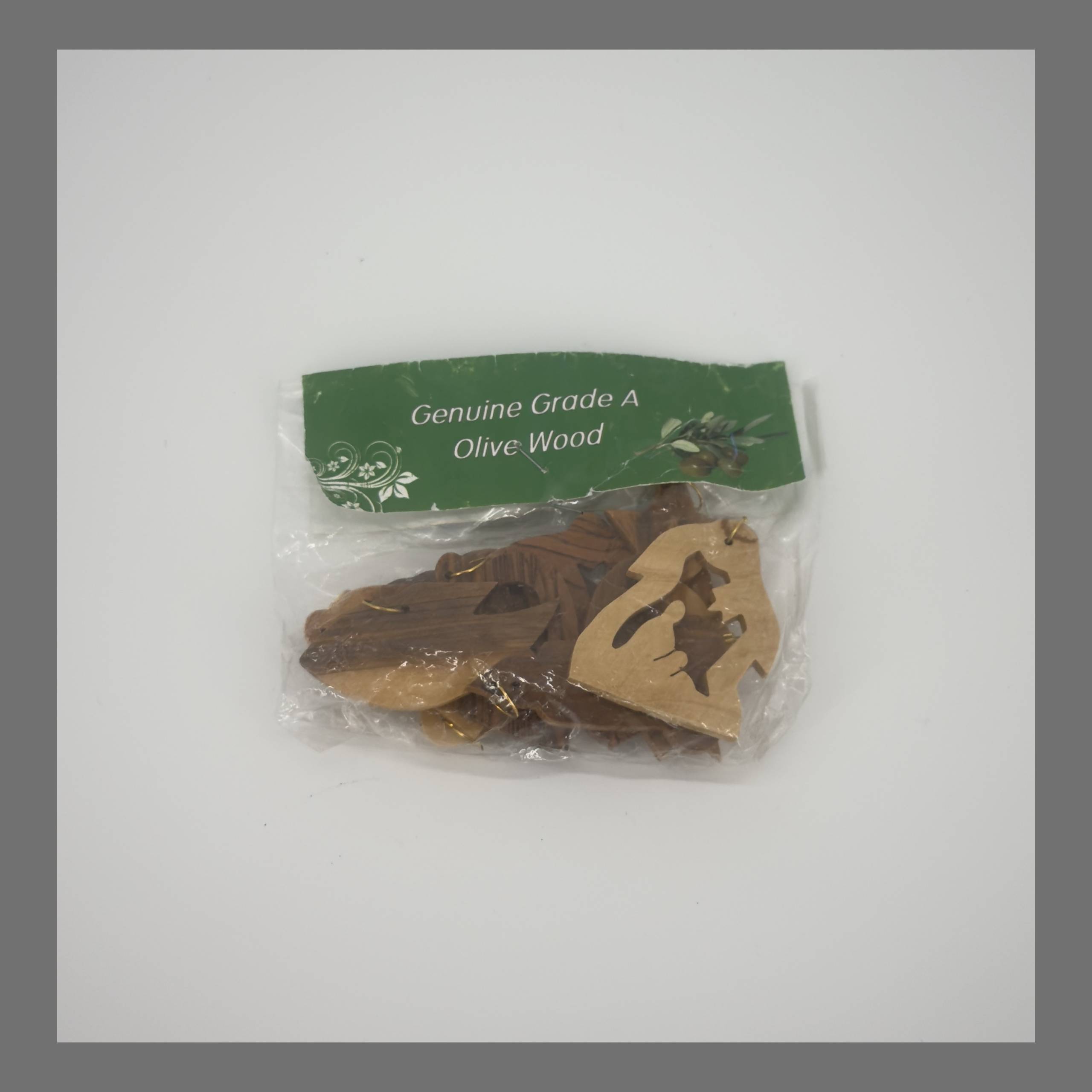 bagged assorted flat olive wood Christmas ornaments. Symbolizing christmas / nativity assortment. Clear plastic retail polybag sealed with a green header card reading ‘Genuine Grade A Olive Wood’. Contents visible: multiple flat laser-cut or scroll-cut olive wood ornament shapes — at least one nativity scene silhouette (star of Bethlehem + manger outline) and darker pieces visible. Gold hanging strings present. Mixed light and dark wood tones suggesting natural grain variation.