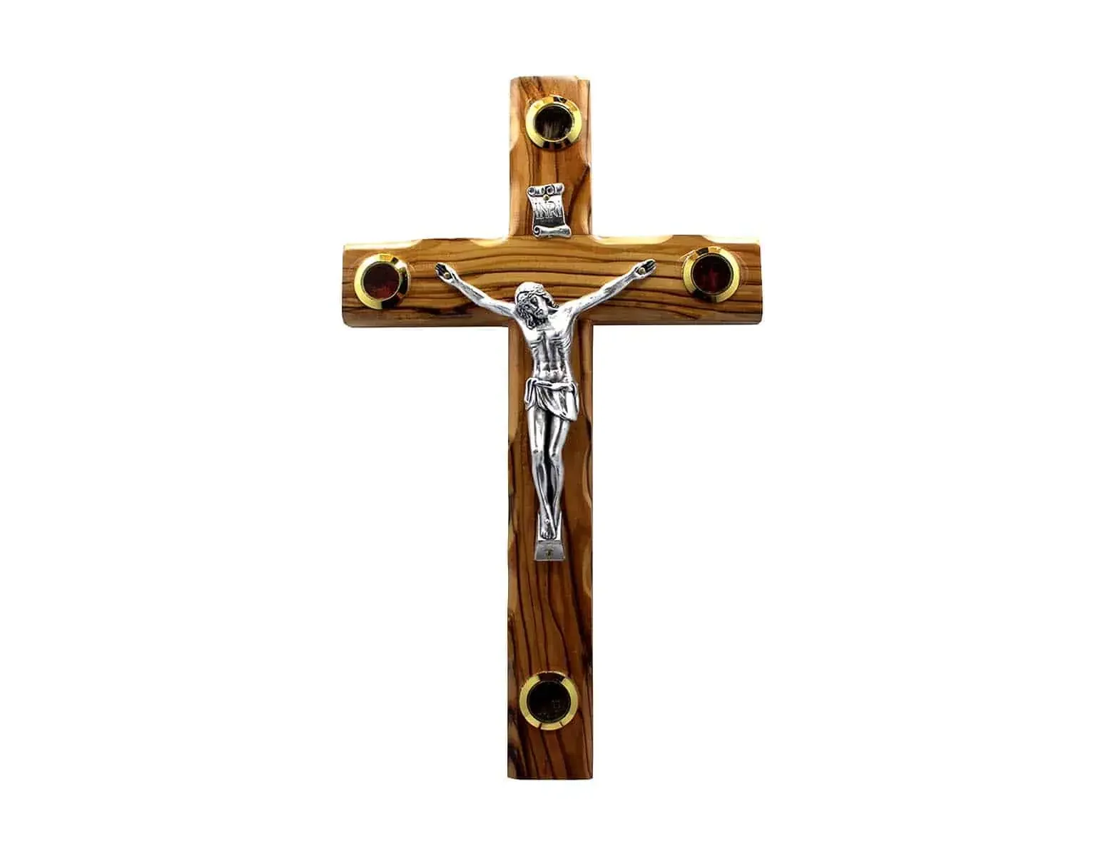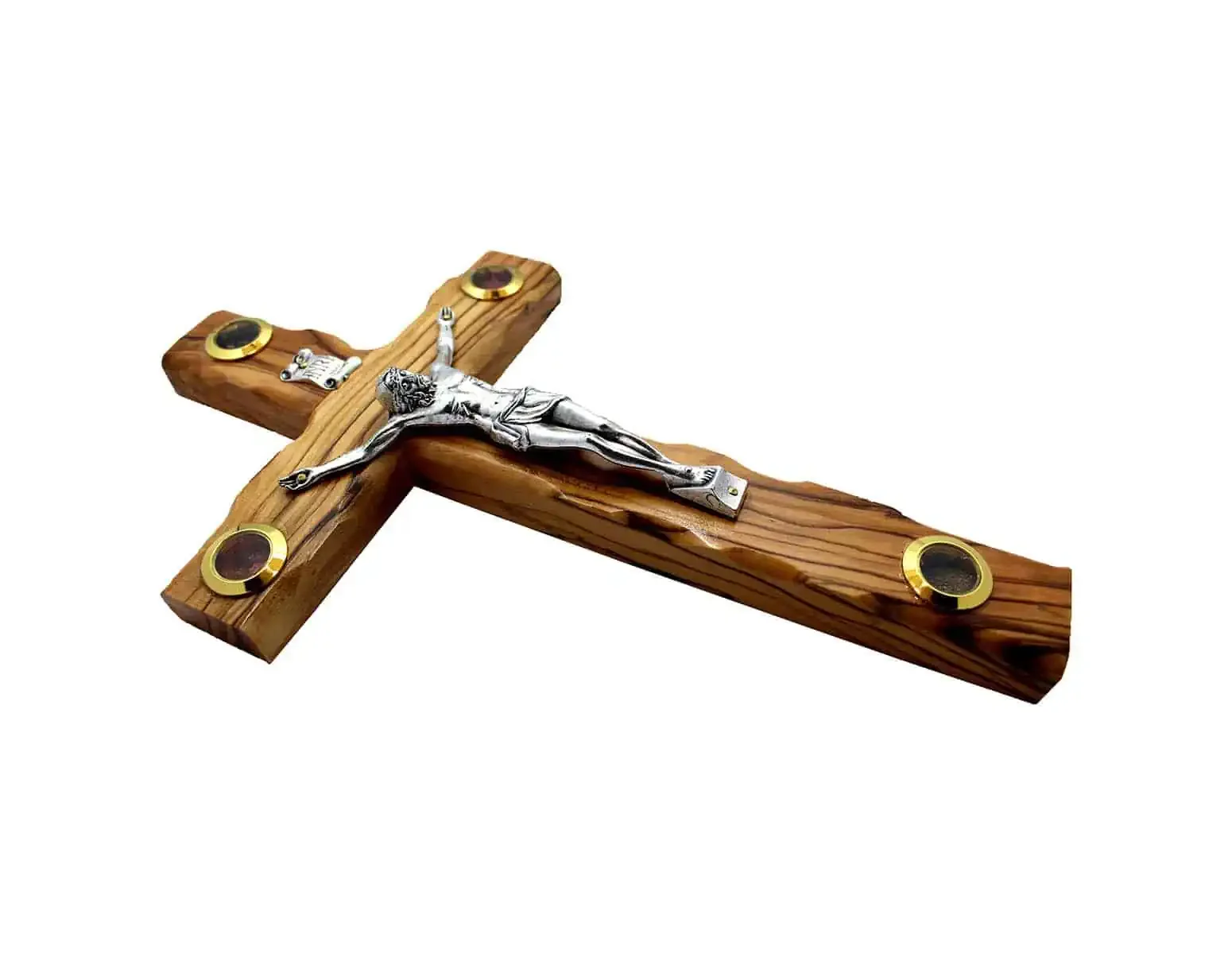 This beautifully finished Catholic Crucifix is handmade in the Holy Land from sustainably harvested, authentic Bethlehem Olivewood with a metallic Jesus figurine, INRI plaque, and embedded glass capsules with brass bezels that contain soil, stones, flower petals, and olive leaf flakes from Bethlehem.