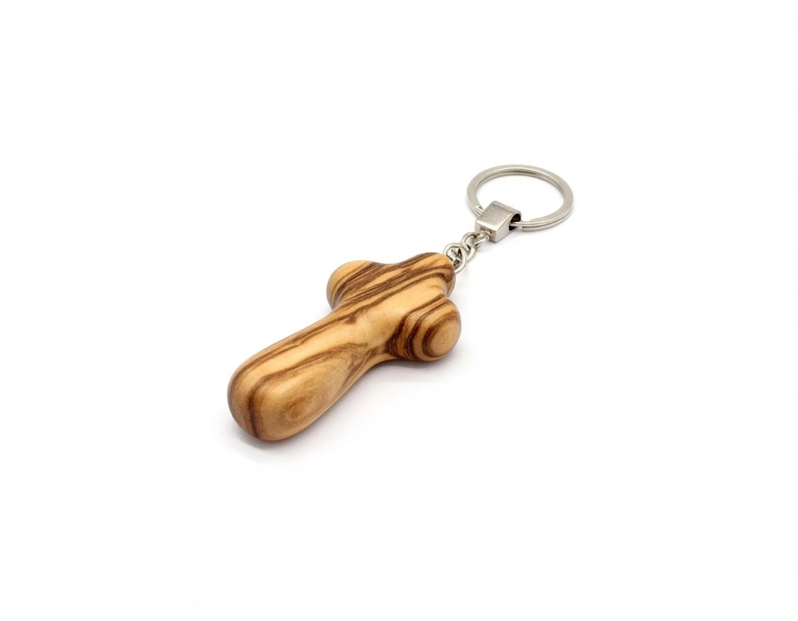 This beautiful Cross keychain is handmade in the Holy Land from sustainably harvested, authentic Bethlehem olive wood. This one-of-a-kind, elegantly hand-carved keychain is made from the finest prunings of Holy Land olive trees. This cross is designed to fit comfortably in the palm of your hand, making it ideal for prayer or meditation.