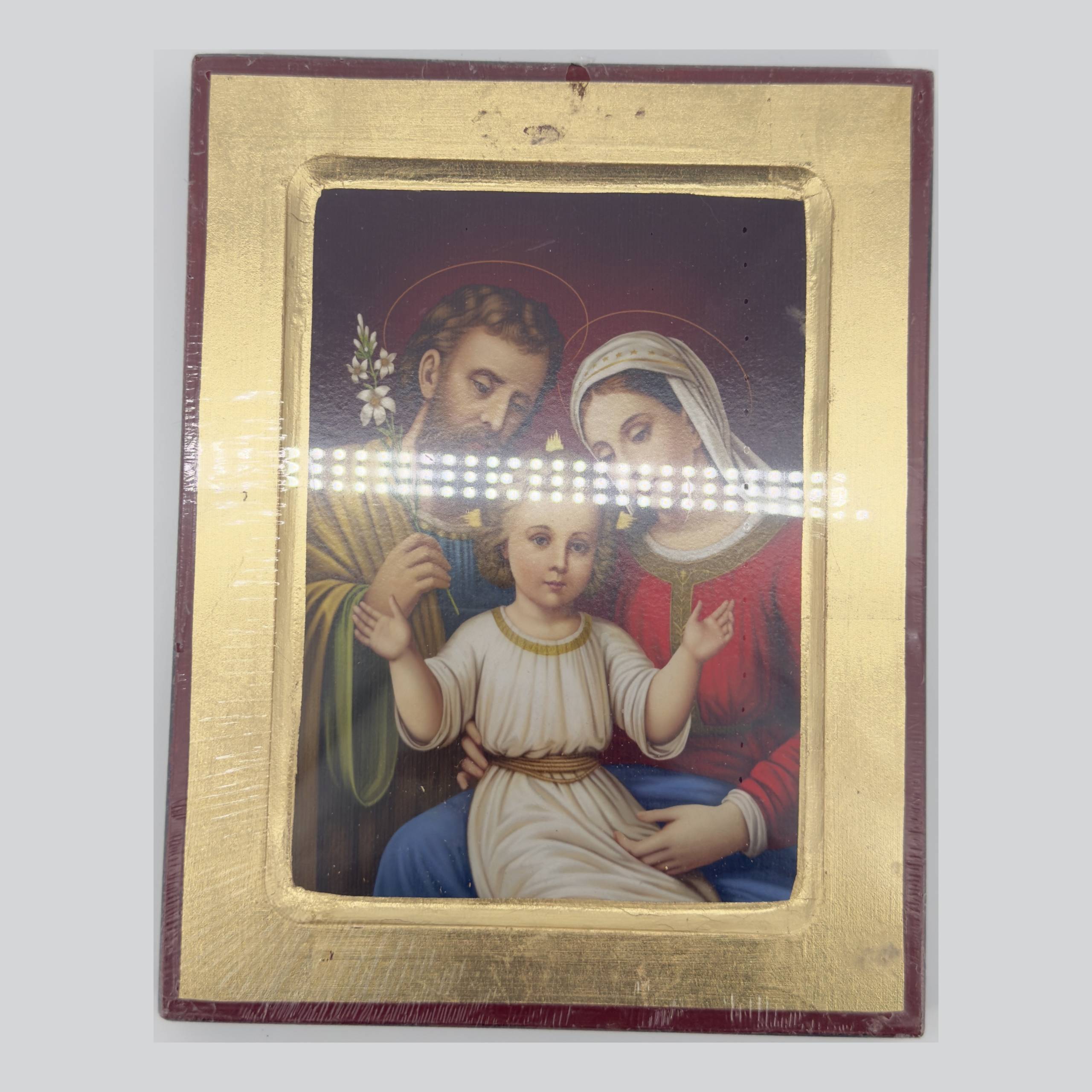Religious icon print on gold-leaf board — Holy Family (Saint Joseph, Virgin Mary, Child Jesus) depicted in Western/Catholic style painting. Symbolizing holy family — joseph, mary, and child jesus; catholic devotional iconography. Materials include printed image on wood/mdf board with gold-leaf border, burgundy outer frame. Same board format as IMG_2650 — burgundy outer frame with gold-leaf border. Central image shows Holy Family in Western painting style: Joseph (left, gold/green robes, holding white lily), Mary (right, red dress, white veil), Child Jesus (center foreground, white tunic with gold belt, arms outstretched). All three figures have circular halos. Dark red/maroon background. Child is seated, appearing to face viewer. Still in factory plastic shrink wrap with glare band across center.