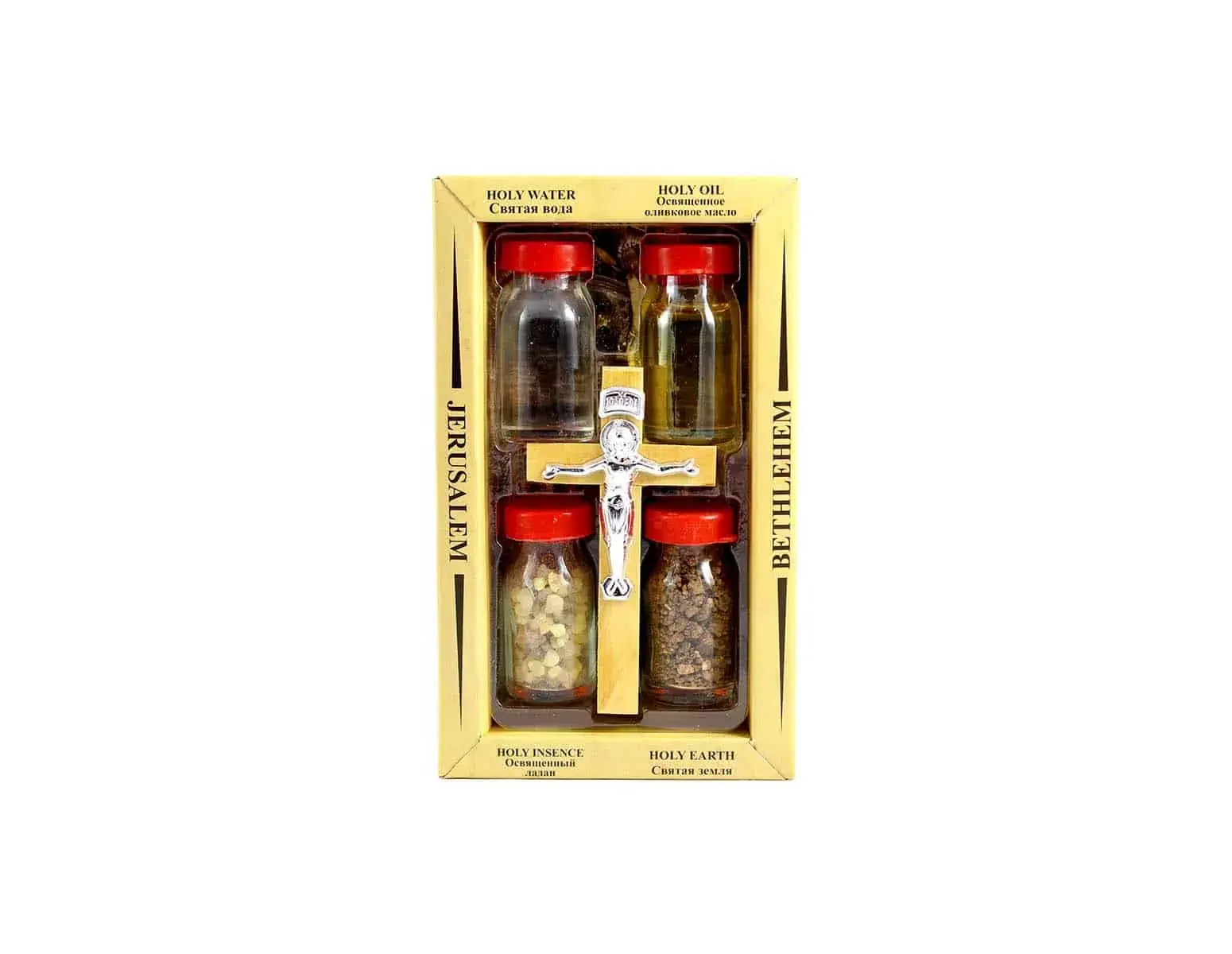This is a boxed set containing an olive wood cross with crucifix and 4 miniature bottles containing Holy Anointing Olive Oil pressed in Bethlehem, Holy Earth from the Hills of Bethlehem, purifying water from the Jordan River and incense.