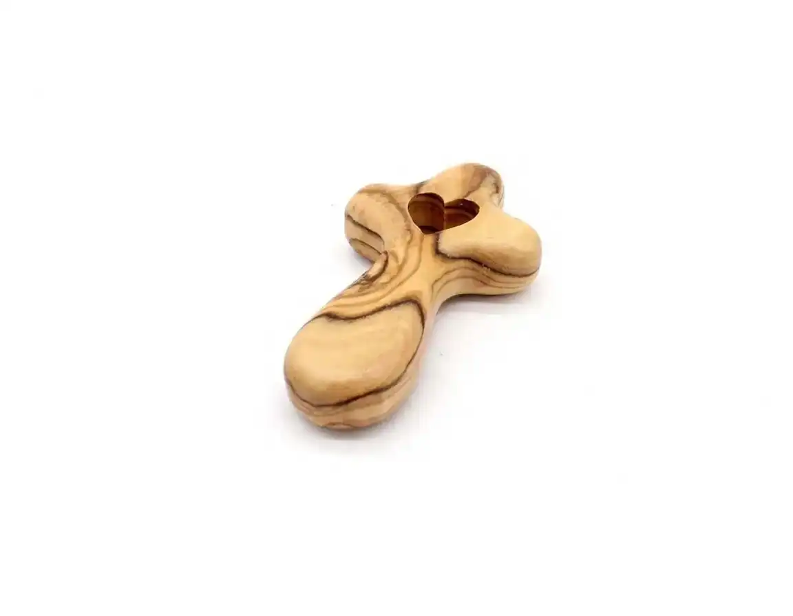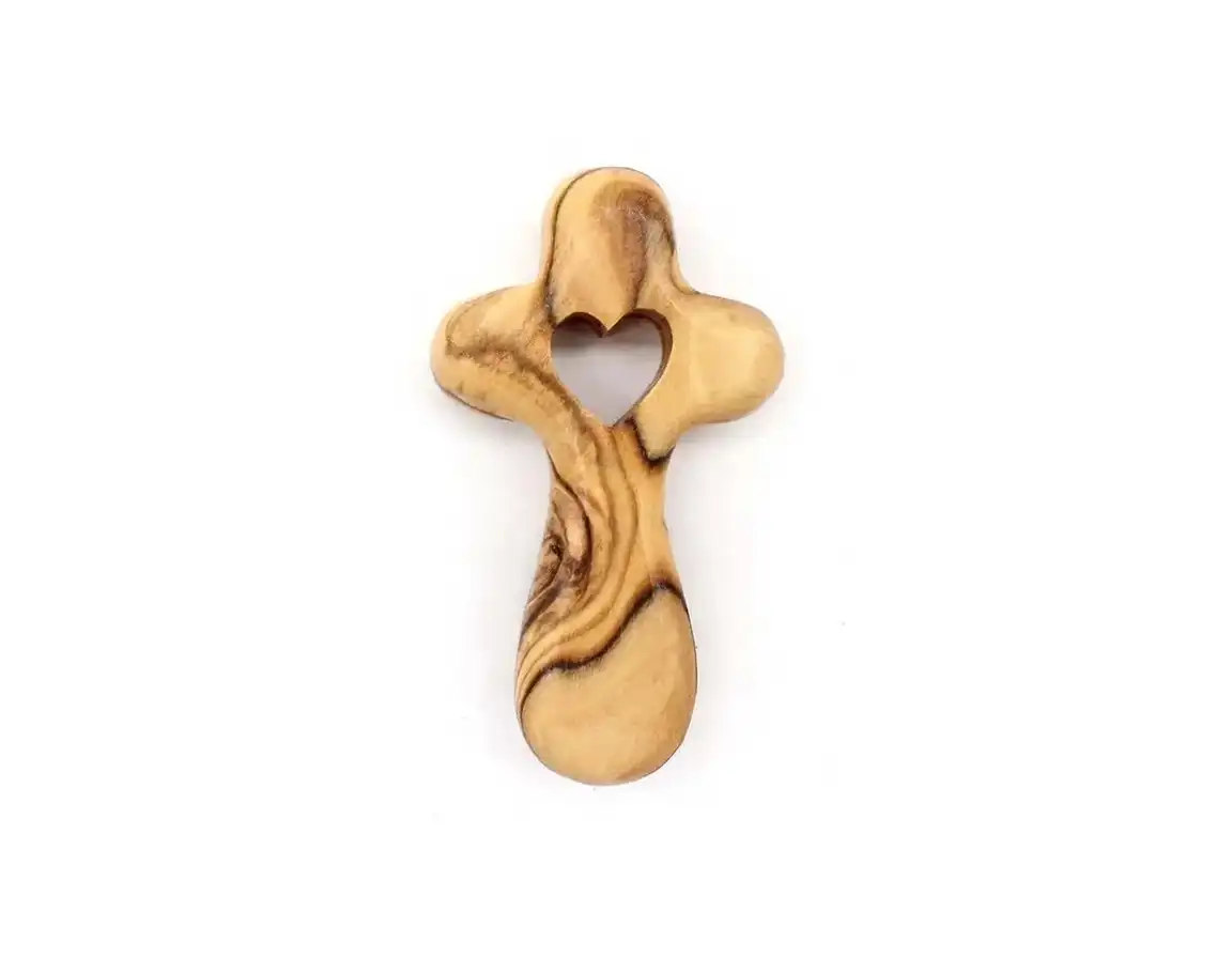 This beautifully hand-carved olive wood comfort holding cross features a heart delicately carved in the center, symbolizing love and faith. Crafted from authentic Bethlehem olive wood, the cross is designed to be held in the hand, offering comfort during prayer, meditation, or moments of reflection. It also makes a meaningful gift for loved ones.