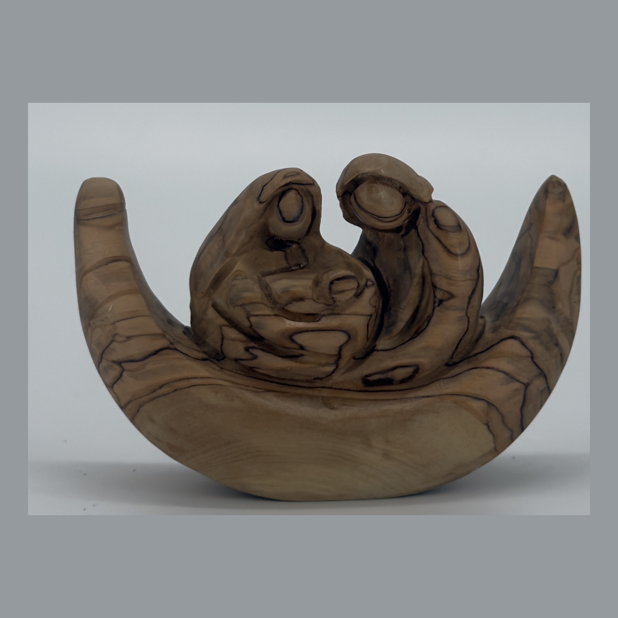 Abstract olive wood Holy Family in cupped hands sculpture — Mary, Joseph, and infant in gestural hand-shaped form. Symbolizing holy family / god’s protection. Unique sculptural form: a pair of large cupped/open hands carved from olive wood serving as the base/vessel, with three small abstract Holy Family figures (two adult heads and baby) nestled within the palm. Crescent/bowl shape with upturned wing-like finger forms on outer edges. Strong dark/light olive wood grain pattern throughout. Very smooth finish. Wide horizontal format. Estimated width ~20–25 cm.