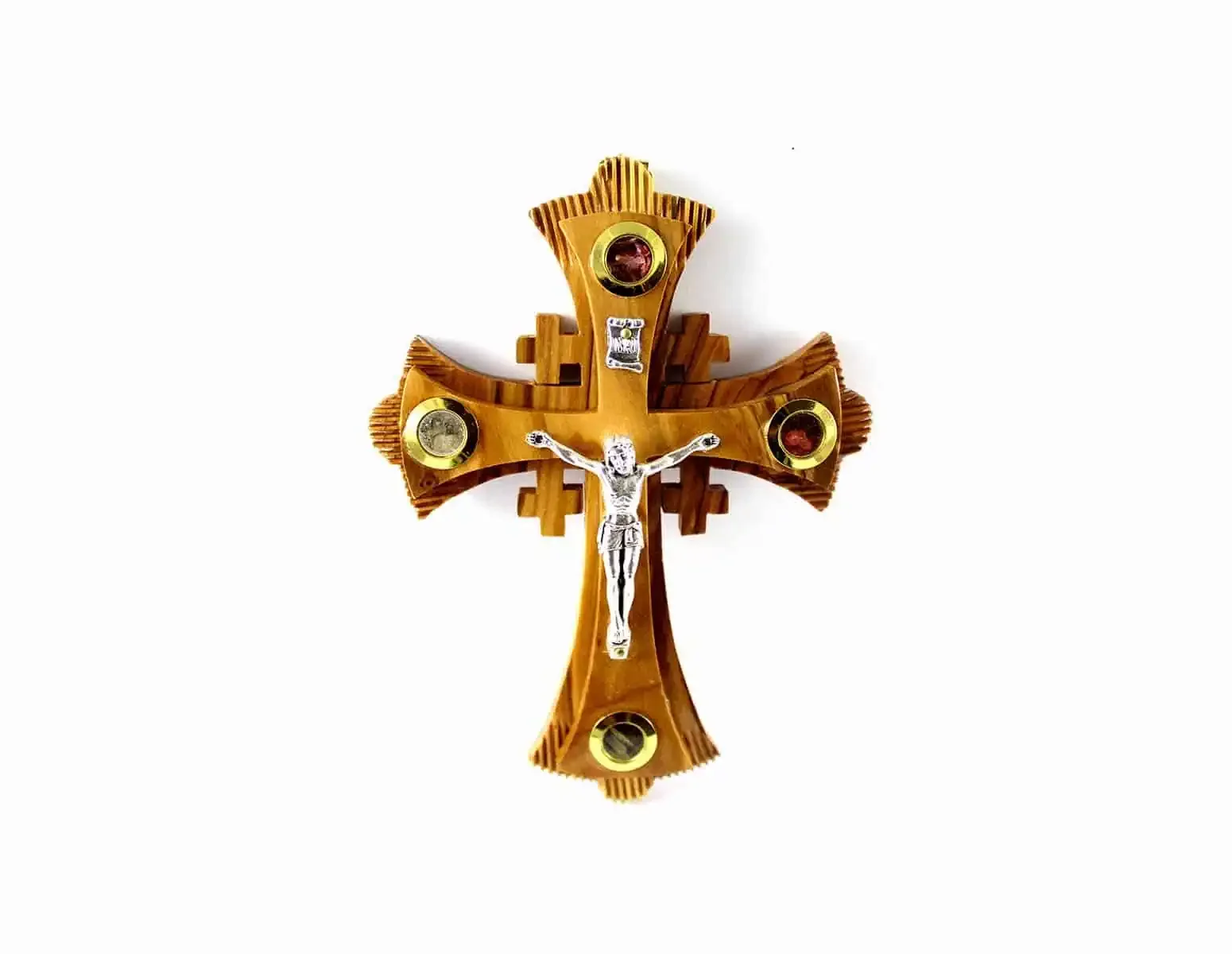 This exclusive Jerusalem Cross is handmade in the Holy Land from sustainably harvested, authentic Bethlehem Olivewood. and embedded glass capsules with brass bezels that contain soil, stones, flower petals, and olive leaf flakes from Bethlehem. It comes with beautifully detailed pewter (silver plated) crucifix. This cross is hand carved in the traditional “Jerusalem” style which represents the Apostles spreading the message of Jesus Christ to the four corners of the world. Let it stand on your desk as a reminder of the Holy Land.