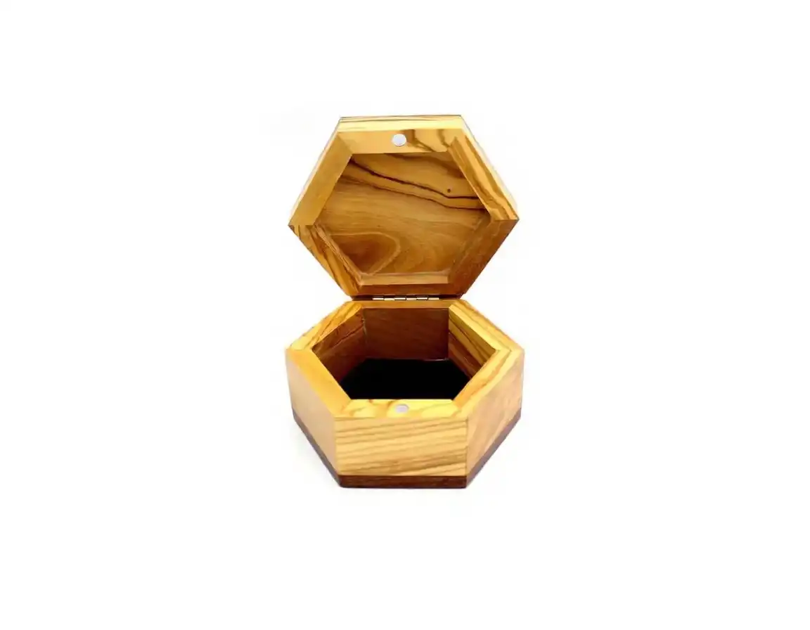 This elegant jewelry / rosary box is handcrafted in the Holy Land from sustainably harvested, authentic Bethlehem Olivewood. The wood used to make this box was hand-selected to ensure a rich, contrasting grain pattern. It also has a magnetic seal, black felt lining and a solid mahogany base.