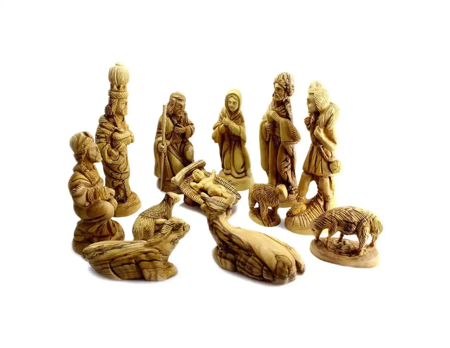 These beautiful nativity figurines are handmade in the Holy Land from sustainably harvested, authentic Bethlehem Olivewood. Using only non-productive olive trees from Holy Land, this handmade piece reveals the stunning grain patterns of raw olive wood, free of any additives or sealants.