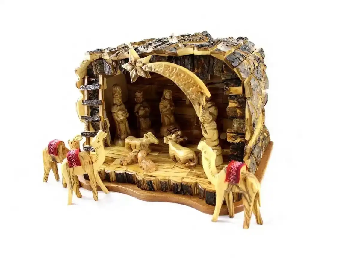 This beautiful nativity set is handmade in the Holy Land from sustainably harvested, authentic Bethlehem Olivewood. Using only non-productive olive trees from Holy Land, this handmade piece reveals the stunning grain patterns of raw olive wood, free of any additives or sealants. The figures include Mary and Joseph and Jesus, the three wise men and the good shepherd. The animals include the donkey, the cattle cow, and two lambs and three camels. It is beautifully crafted and makes a wonderful central theme in the celebration of Christmas.