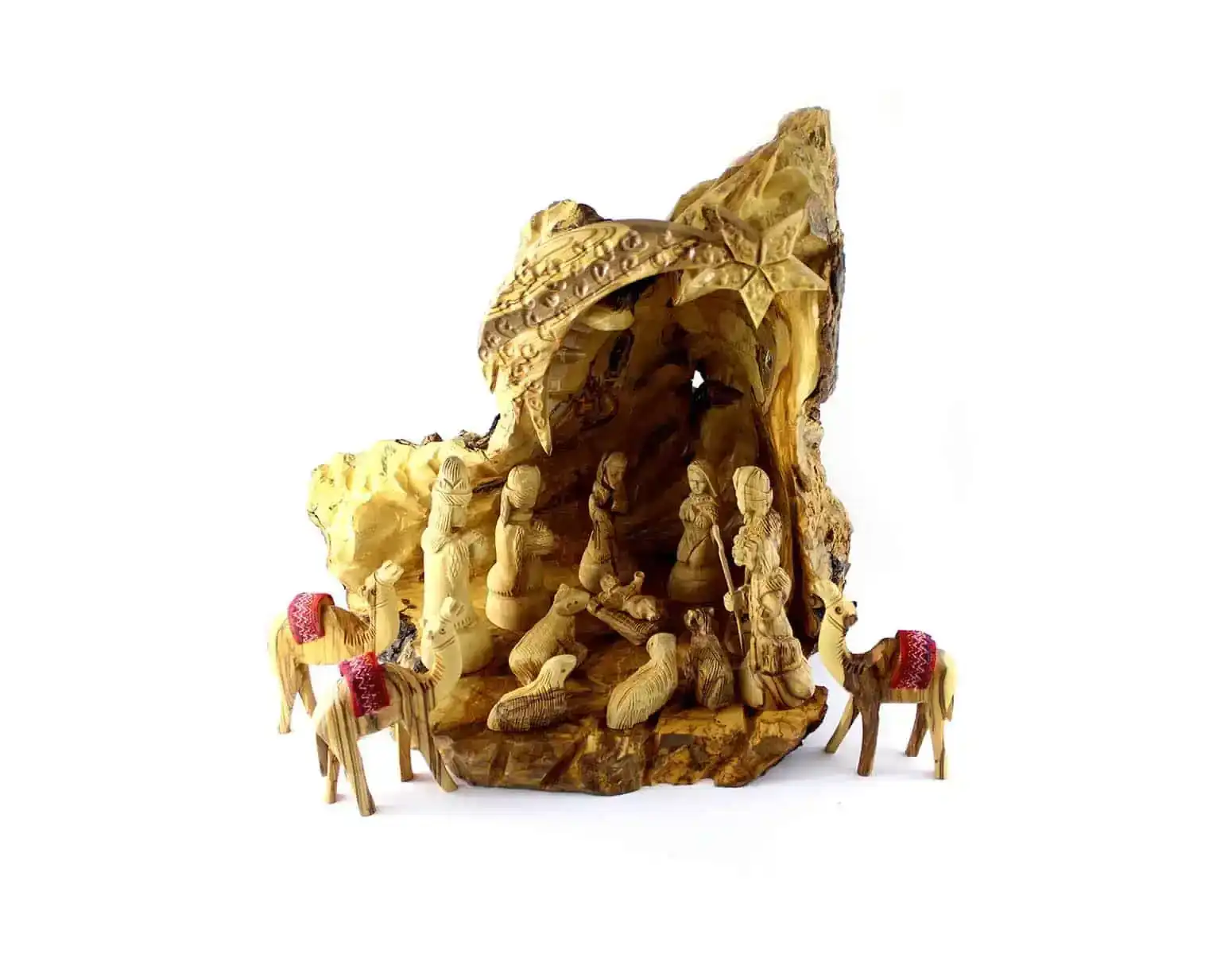 This beautiful nativity set with an unique stable is handmade in the Holy Land from sustainably harvested, authentic Bethlehem Olivewood. Using only non-productive olive trees from Holy Land, this handmade piece reveals the stunning grain patterns of raw olive wood, free of any additives or sealants. The figures include Mary and Joseph and Jesus, the 3 wise men and the little shepherd boy. The animals include the donkey, the cattle cow, and two lambs, and 3 camels. It is beautifully crafted and makes a wonderful central theme in the celebration of Christmas.