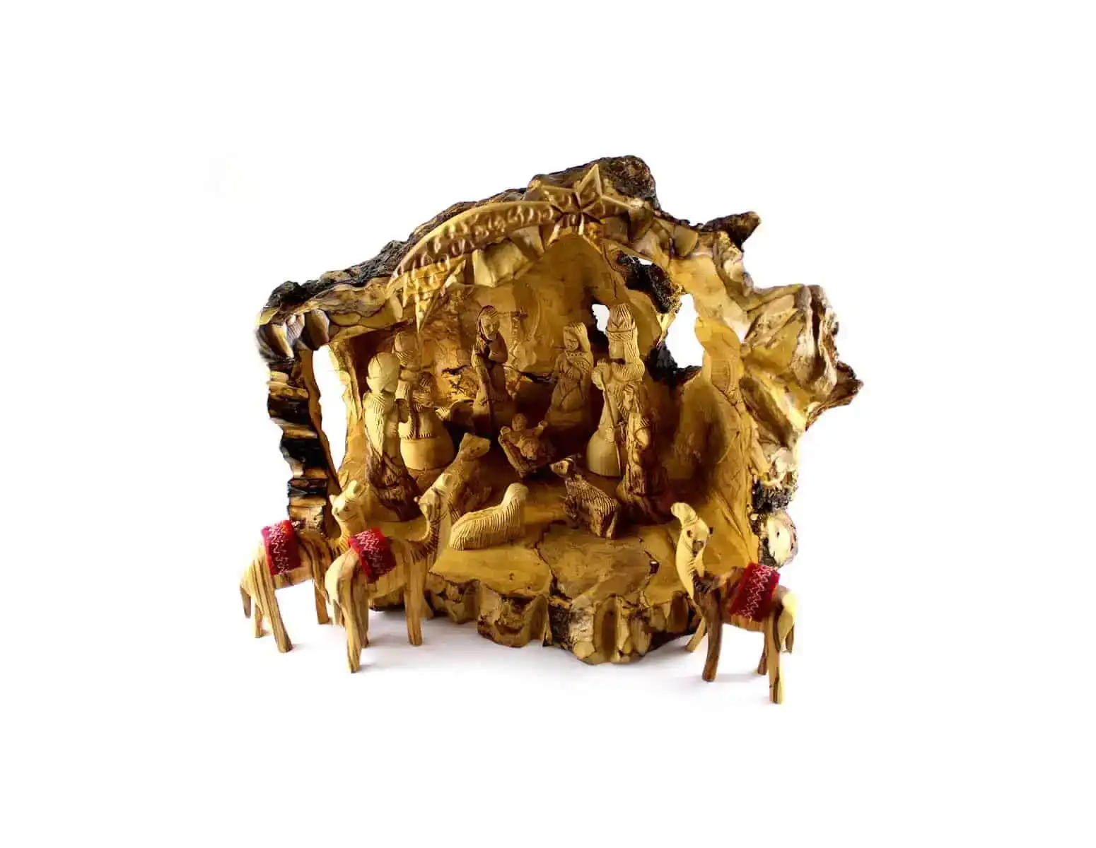 This beautiful nativity set with an unique stable is handmade in the Holy Land from sustainably harvested, authentic Bethlehem Olivewood. Using only non-productive olive trees from Holy Land, this handmade piece reveals the stunning grain patterns of raw olive wood, free of any additives or sealants. The figures include Mary and Joseph and Jesus, the 3 wise men and the little shepherd boy. The animals include the donkey, the cattle cow, and two lambs, and 3 camels. It is beautifully crafted and makes a wonderful central theme in the celebration of Christmas.