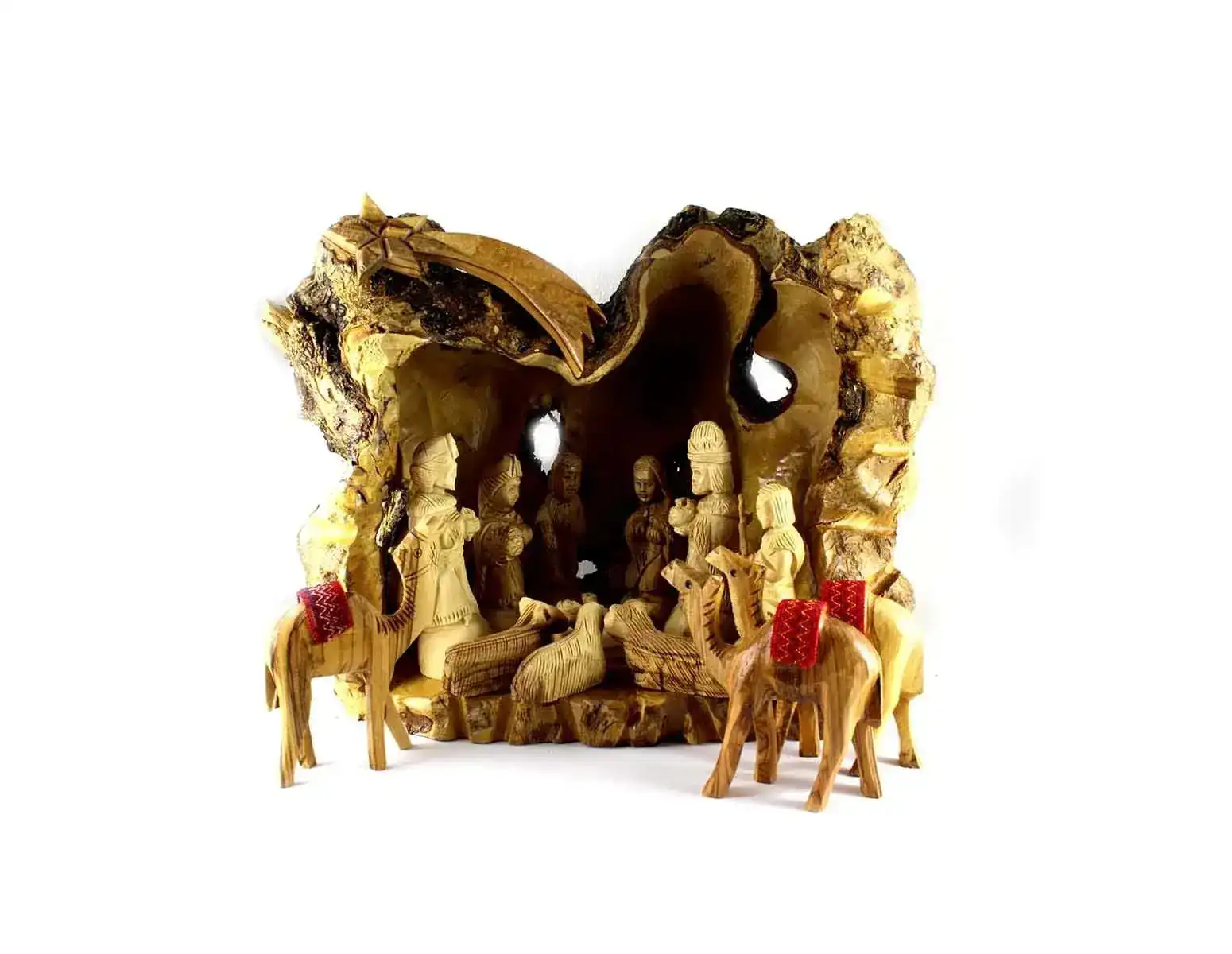 This beautiful nativity set with an unique stable is handmade in the Holy Land from sustainably harvested, authentic Bethlehem Olivewood. Using only non-productive olive trees from Holy Land, this handmade piece reveals the stunning grain patterns of raw olive wood, free of any additives or sealants. The figures include Mary and Joseph and Jesus, the 3 wise men and the little shepherd boy. The animals include the donkey, the cattle cow, and two lambs, and 3 camels. It is beautifully crafted and makes a wonderful central theme in the celebration of Christmas.