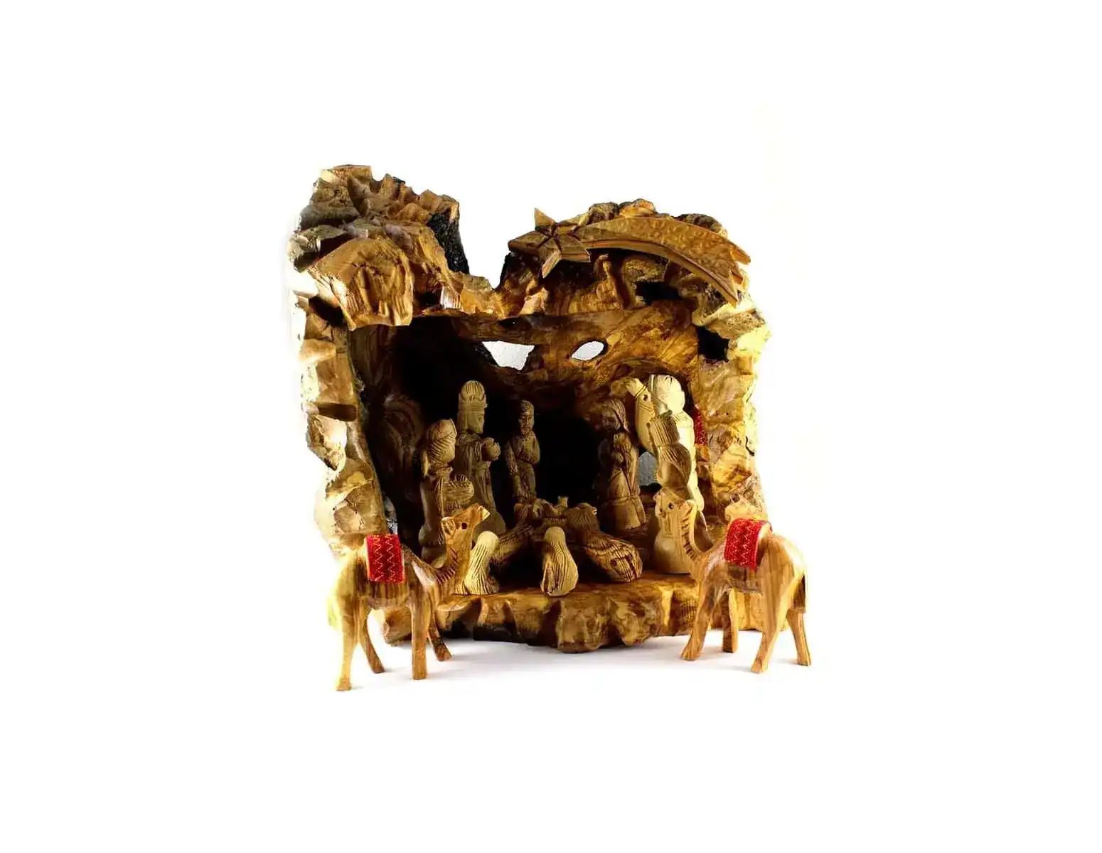 This beautiful nativity set with an unique stable is handmade in the Holy Land from sustainably harvested, authentic Bethlehem Olivewood. Using only non-productive olive trees from Holy Land, this handmade piece reveals the stunning grain patterns of raw olive wood, free of any additives or sealants. The figures include Mary and Joseph and Jesus, the 3 wise men and the little shepherd boy. The animals include the donkey, the cattle cow, and two lambs, and 3 camels. It is beautifully crafted and makes a wonderful central theme in the celebration of Christmas.
