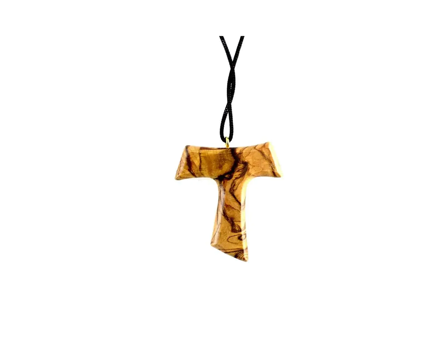 This beautiful pendant cut in the shape of a Tau Cross is handmade in the Holy Land from sustainably harvested, authentic Bethlehem Olivewood. It comes on a strong black cord that you can adjust to the length you want. It symbolizes the cross of crucifixion. St. Francis of Assisi was especially fond of it as a symbol.