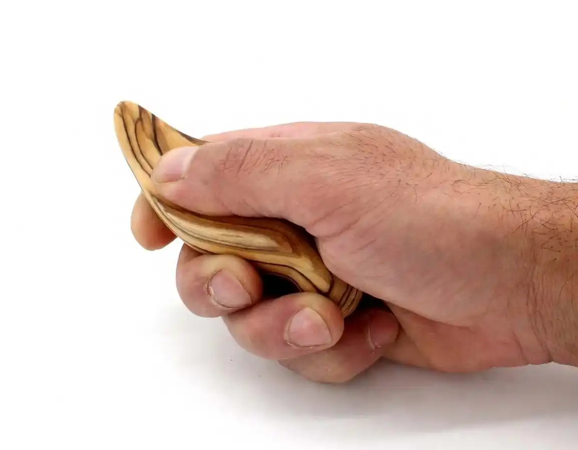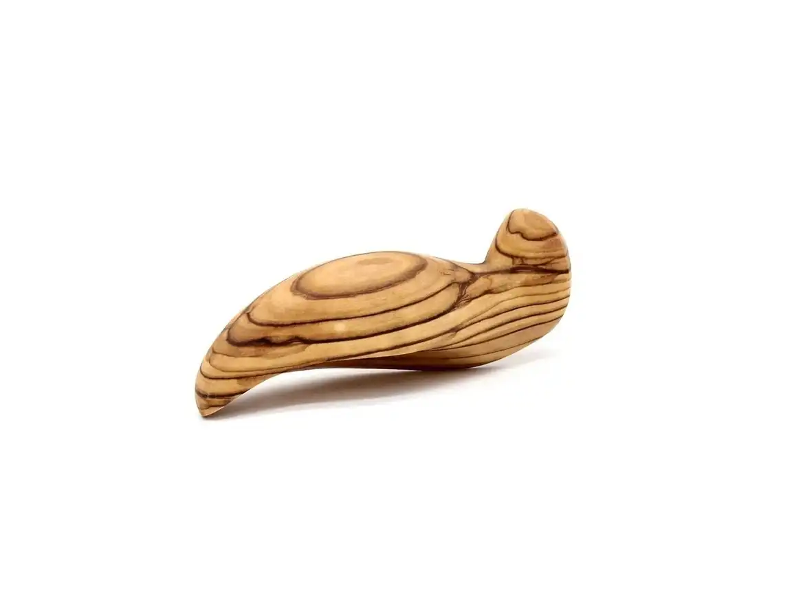 This olive wood abstract figurine is shaped in the silhouette of the Virgin Mary. Yet, beyond its aesthetic appearance it is made to be used for prayer. It is designed to fit comfortably within a closed hand, with a divot below the head for stroking with the thumb, just as one strokes the beads of a rosary.